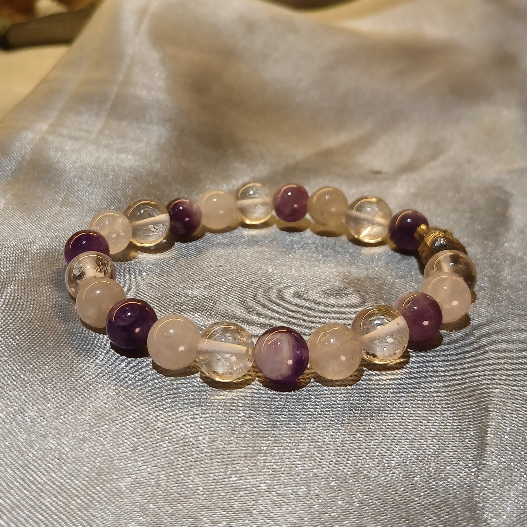 Description : This soothing trio of Rose Quartz, Amethyst, and Clear Quartz nurtures love, inner peace, and emotional healing. Rose Quartz opens the heart, Amethyst calms the mind, and Clear Quartz amplifies their energies—bringing harmony to your relationships.