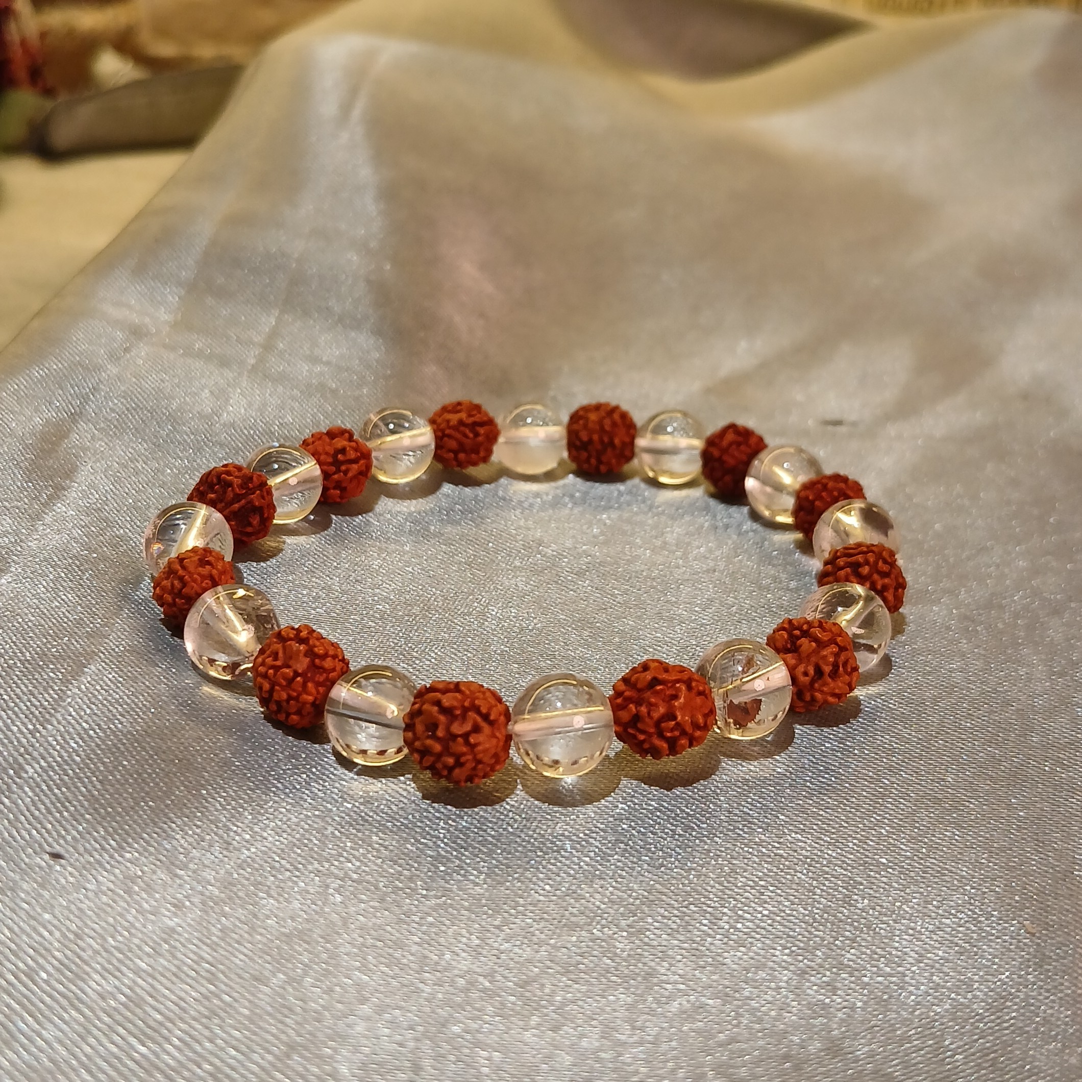 Description : Our Clear Quartz & Rudraksha bracelet crafted from genuine Clear Quartz crystals and sacred Rudraksha beads, this bracelet combines the purifying properties of Clear Quartz with the spiritual significance of Rudraksha.