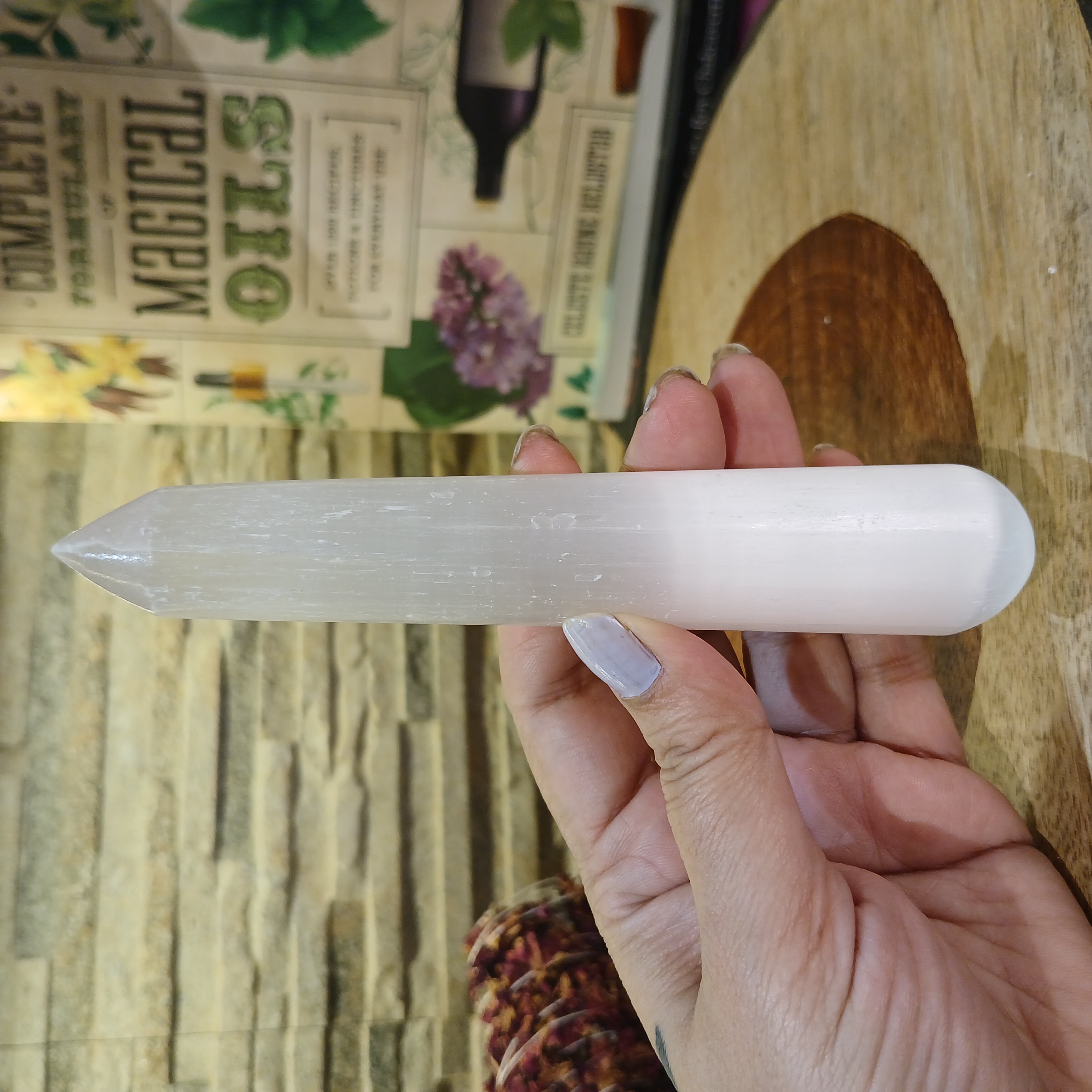 Description : The Selenite Reiki Pencil is a high-vibrational tool Known for its cleansing and purifying properties, Selenite clears negativity, aligns the chakras, and promotes deep peace. Its pointed tip helps direct energy with focus, making it perfect for Reiki, meditation, and aura cleansing.