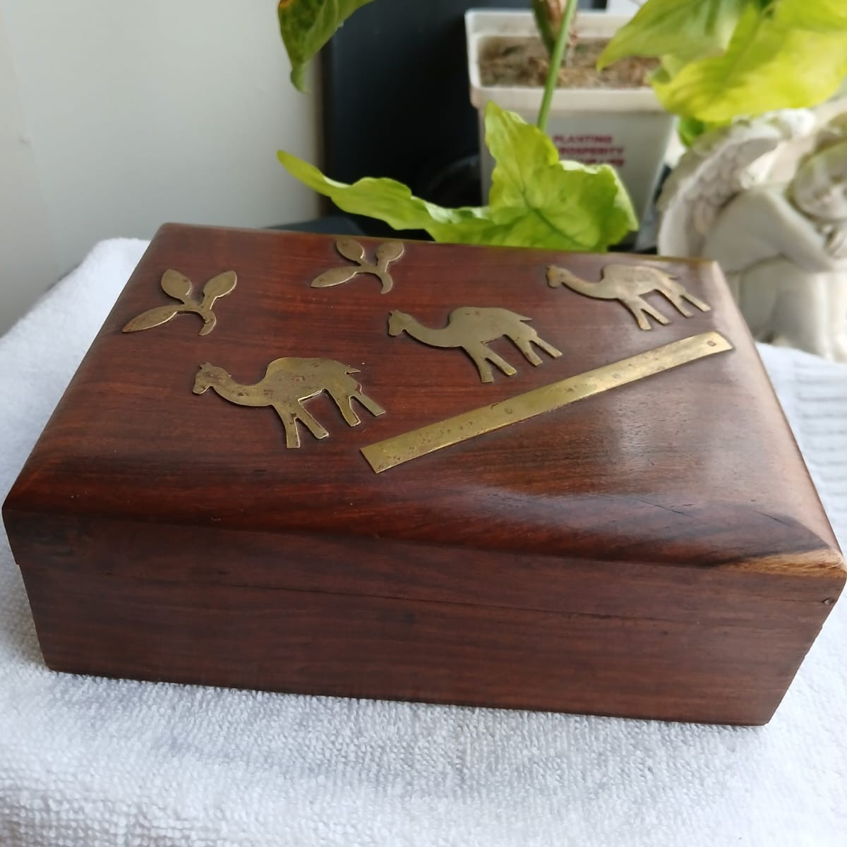 Description : This beautifully handcrafted antique wooden box features elegant brass inlay work of camels and desert motifs, evoking a sense of tradition and wanderlust. Made from pure, high-quality wood, its rustic charm and cultural detailing make it a timeless addition to your sacred space or home decor.
