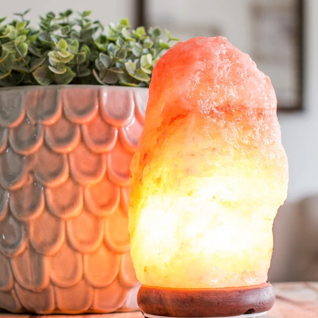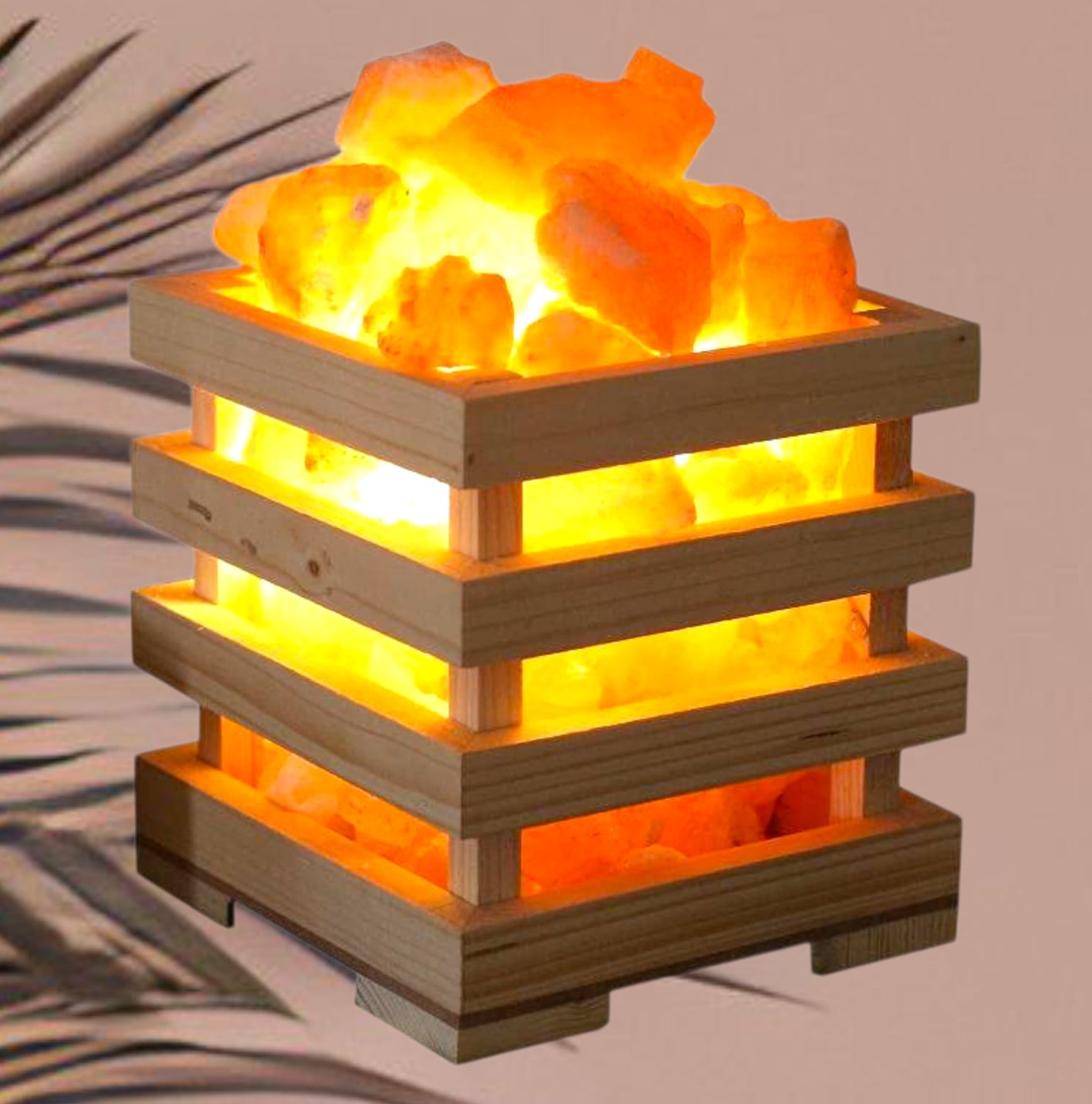 Description : Crafted from raw Himalayan salt chunks and encased in a rustic wooden crate, this lamp radiates a warm, amber glow that purifies the air, reduces stress, and brings grounding energy to your space.