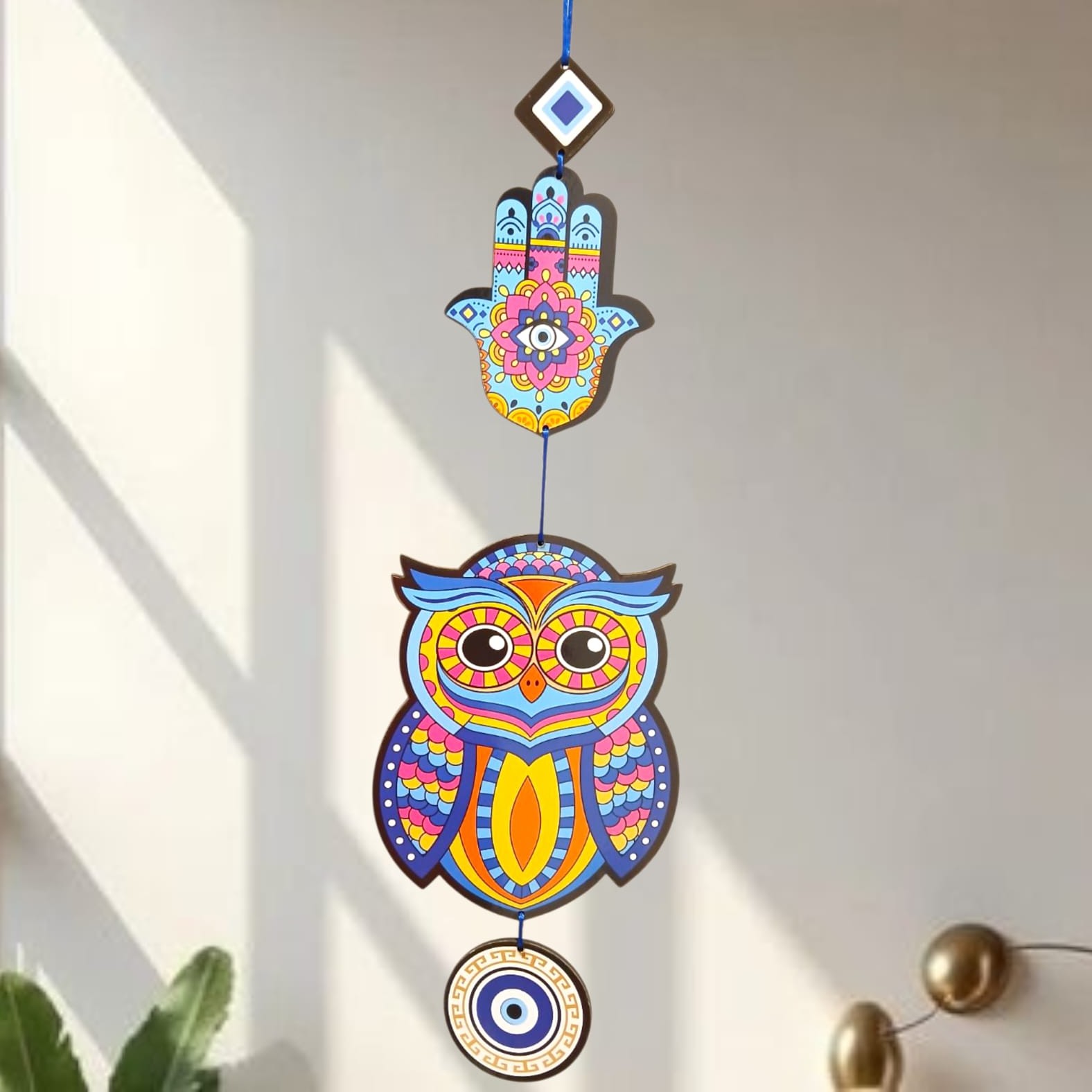 Description : Bring home the power of symbols with this vibrant Wisdom & Protection Hanger. Featuring the Hamsa Hand, Evil Eye, and Owl, it wards off negativity, invites wisdom, and safeguards your space with spiritual energy.