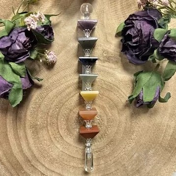 Description : Experience the healing power of our Chakra Pyramid Wand, crafted with seven genuine crystals—each aligned to a specific chakra, from spiritual insight to grounding energy. Topped with a clear quartz point for energy amplification.