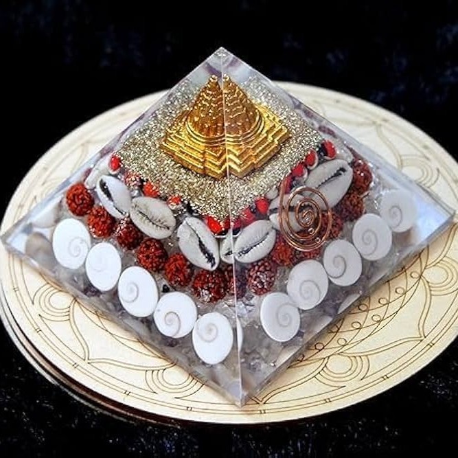 Description : This orgone pyramid combines Shree Yantra, gomti chakras, rudraksha, cowries, and crystals to attract wealth, protection, and spiritual harmony. Ideal for home or workspace.