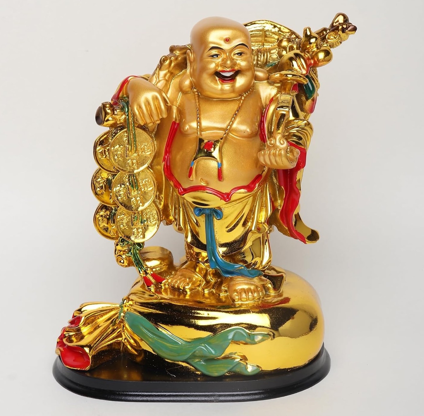 Description : This vibrant golden Laughing Buddha carries wealth coins and a treasure bag, symbolizing prosperity, abundance, and fulfillment. Known to uplift the energy of any space, it brings happiness, financial luck, and a carefree spirit.