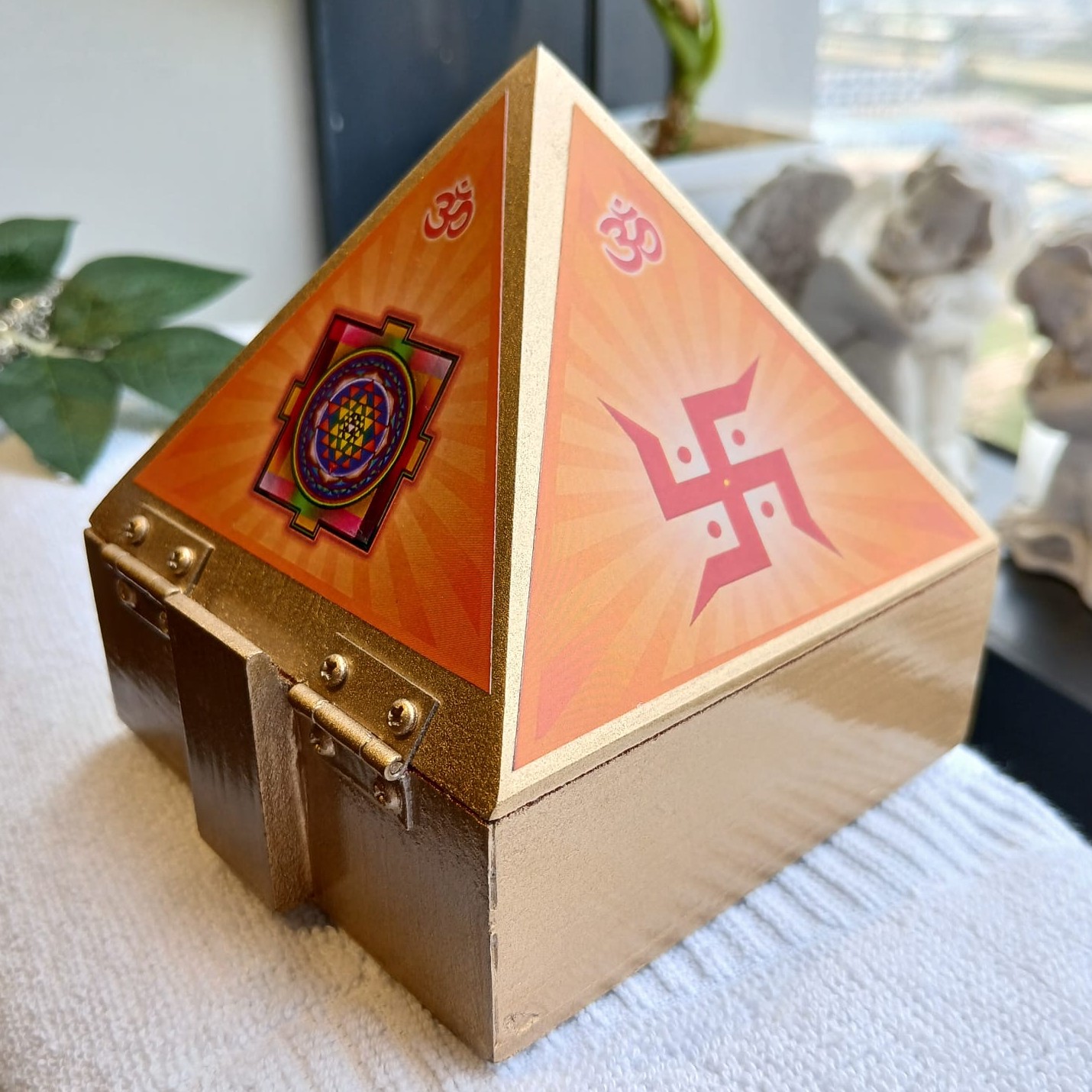Description : The Wish Fulfilment Pyramid Box is a powerful manifestation tool designed to amplify your intentions. Its sacred pyramid shape, combined with mirror strips on all four inner walls, reflects and multiplies energy—accelerating your desires at 2x speed.
